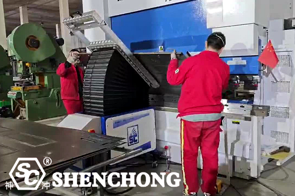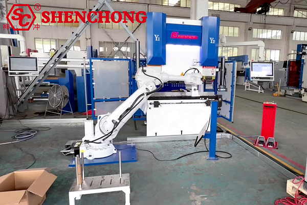 SHENCHONG Italy robotic bending unit deeply integrates a hybrid electric servo CNC press brake with robot ABB IRB 4600-60. Combined with an automatic gripping system, positioning table, and intelligent control software, it achieves fully automated sheet metal feeding, positioning, bending, flipping, and unloading.